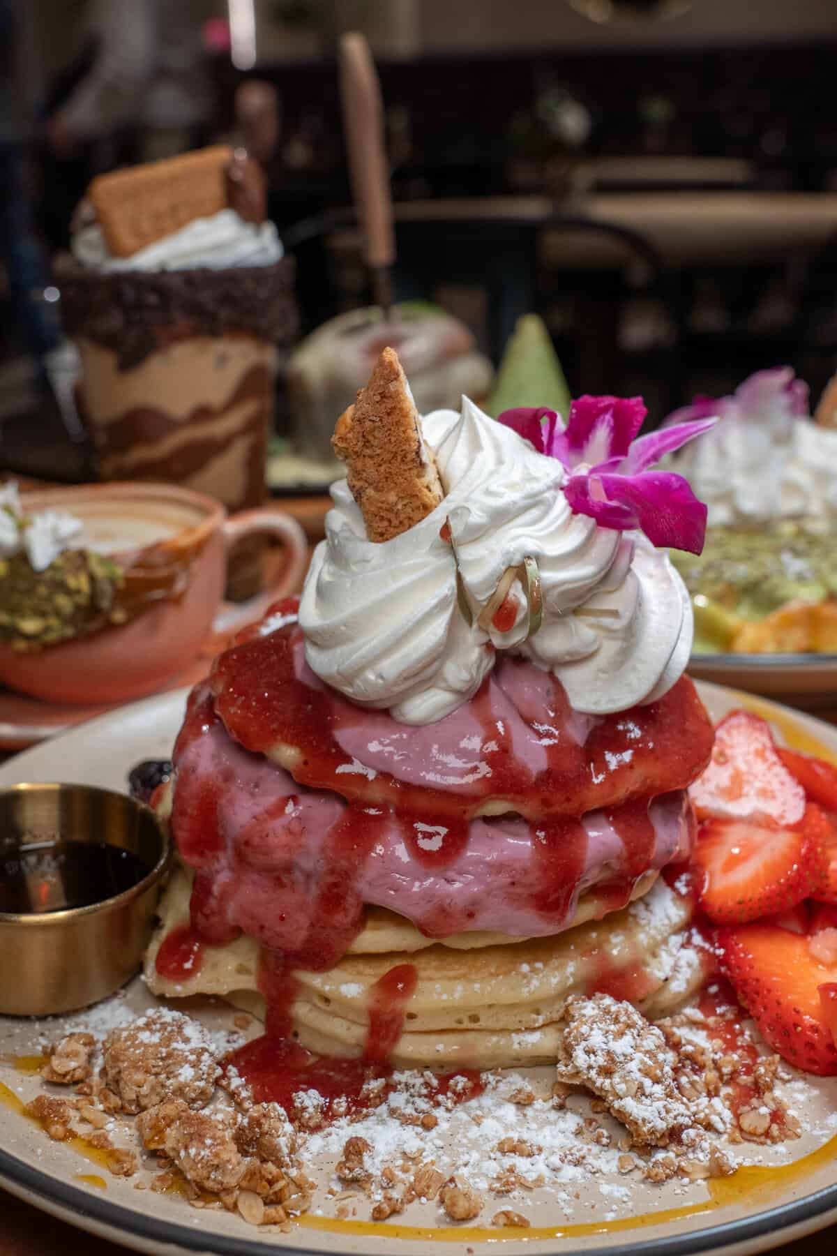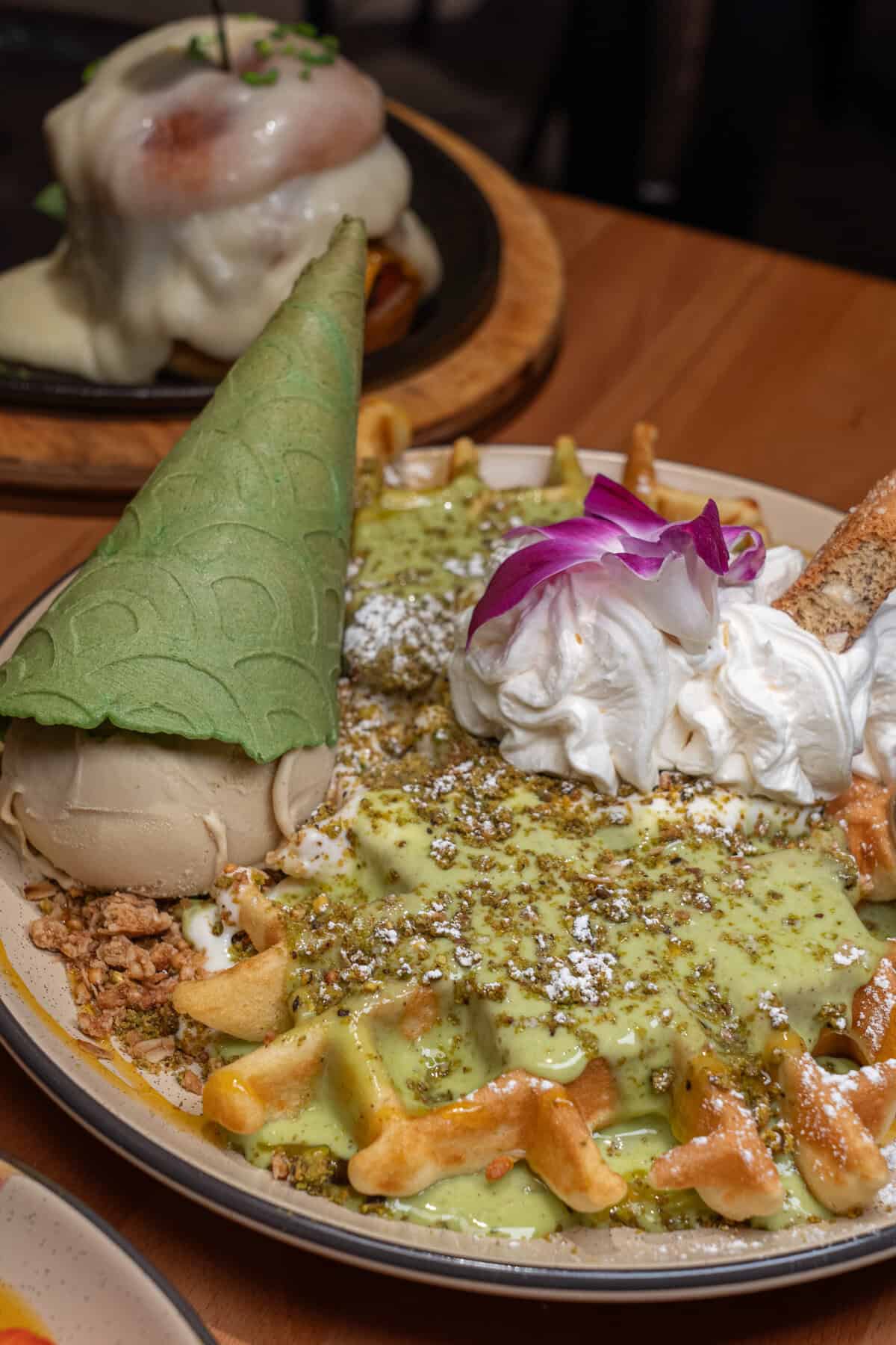 I couldn’t resist their famous Pancake Strawberry and Pistachio Waffle with a red velvet cone, an over-the-top and delicious creation. For something savory, The American Ghost burger was a fantastic choice, served with a side of crispy bacon and covered in melted cheese.