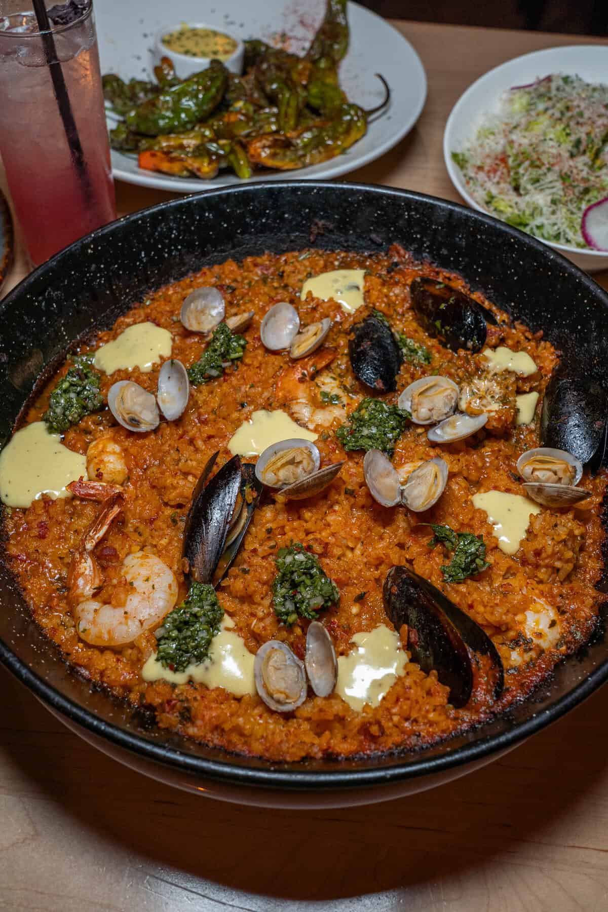 The Grilled Octopus is tender and charred perfectly, the Esquite Salad is fresh and creamy, and the Paella feels like a whole moment. For drinks, get the Nectar of the Babes. Finish with Arroz Con Leche — comfort in a bowl.
